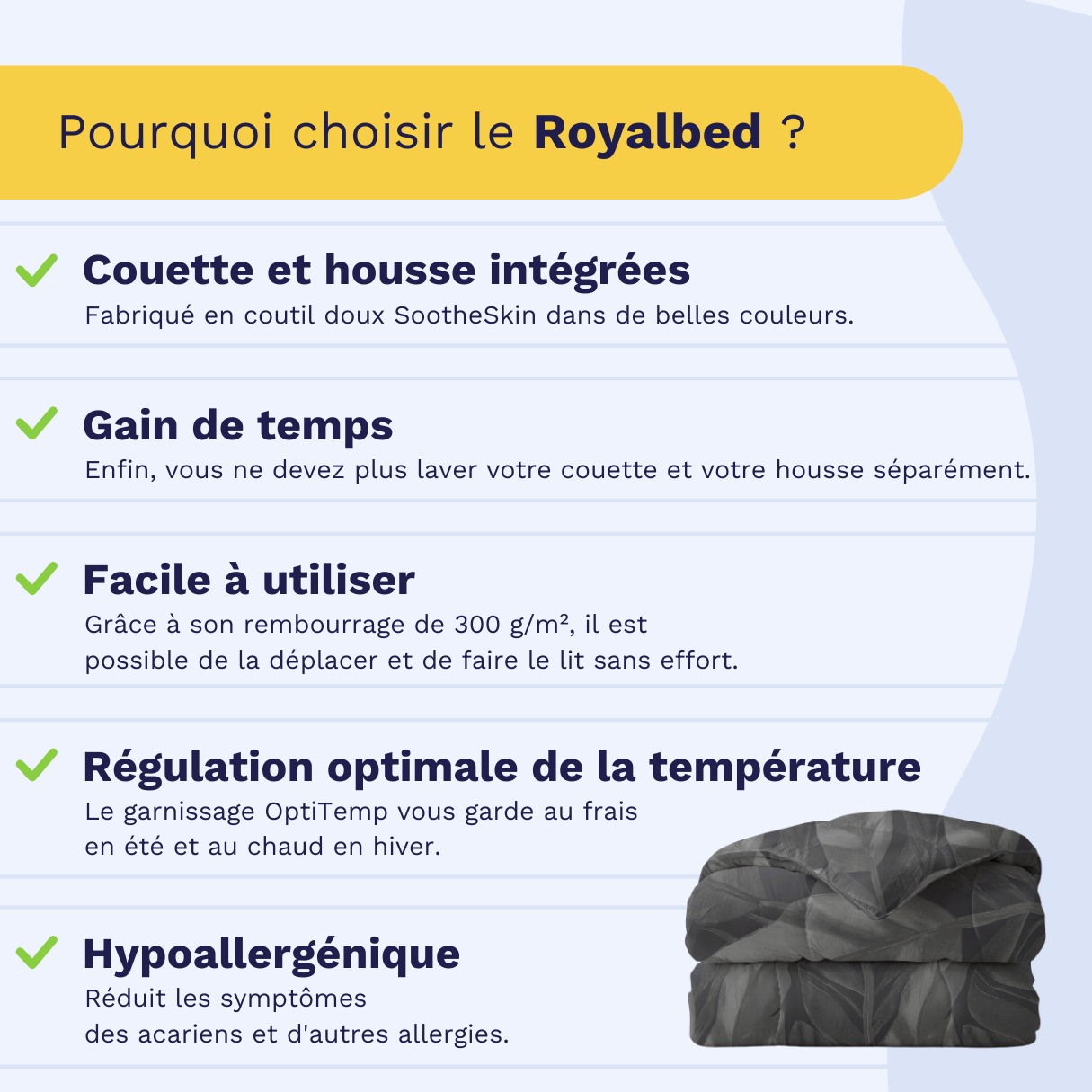 Nos couettes 2-en-1 conviennent à toutes les saisons. Vous n'avez besoin que d'une seule couette pour toute l'année.