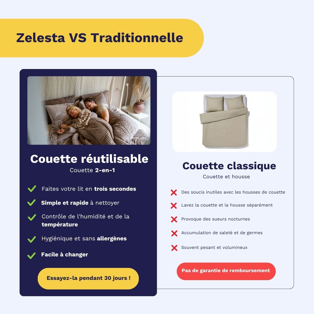 Avec Zelesta, ce cauchemar est terminé. Nos couettes intelligentes avec housse de couette intégrée permettent d'économiser du temps, de l'énergie et de l'argent.