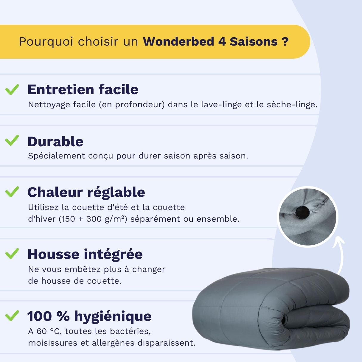 Nos couettes 2-en-1 conviennent à toutes les saisons. Vous n'avez besoin que d'une seule couette pour toute l'année.