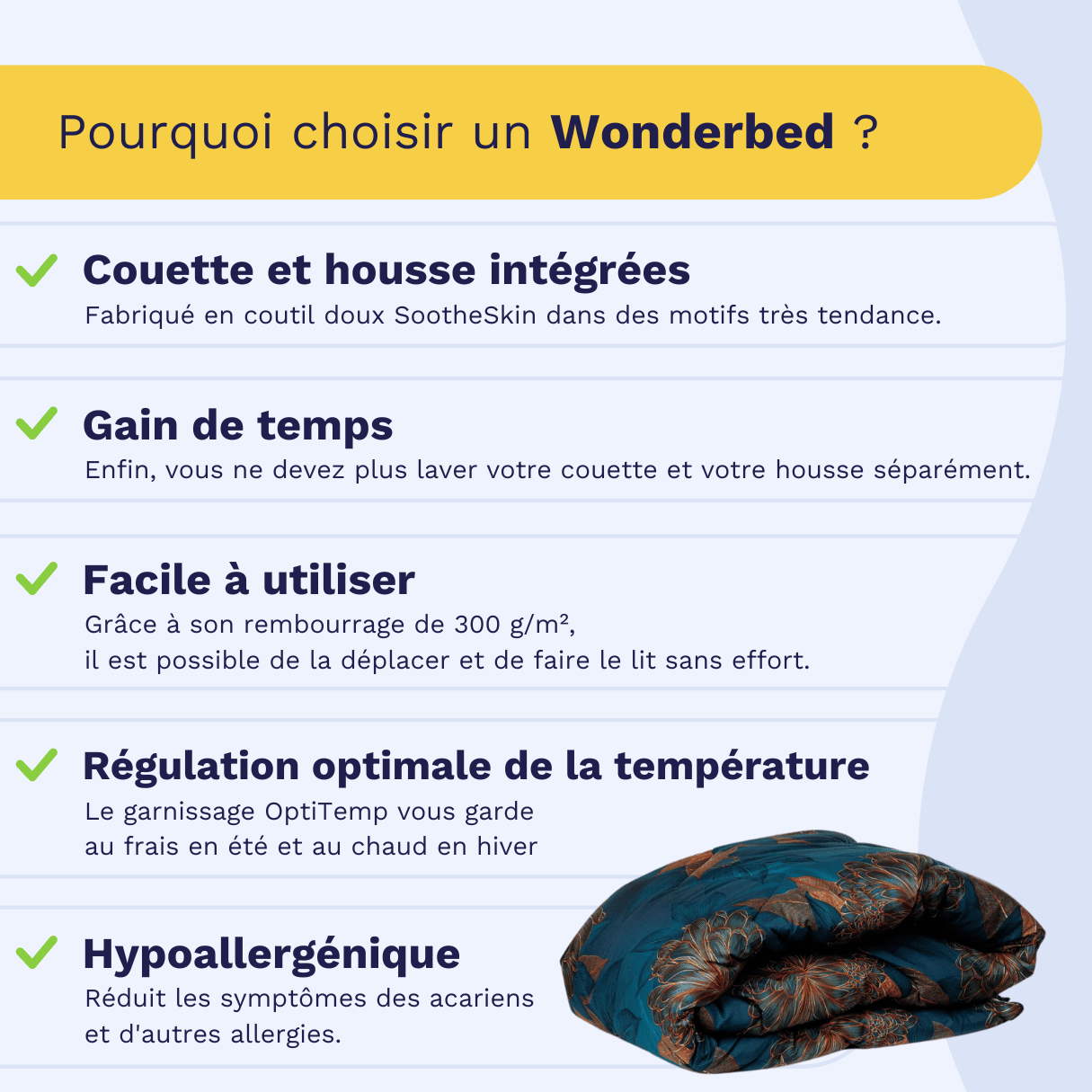 - Nos couettes Wonderbed 2-en-1 sont entièrement lavables, rendant le changement de draps beaucoup plus simple. Ainsi, les moisissures et les bactéries n'ont aucune chance.
